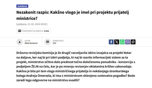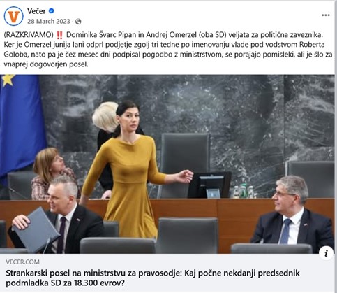 - Da gre za naklepno in načrtno dogovarjanje podpisa pogodbe ter sklepanje posla, kaže že podatek, da je Andrej Omerzel ustanovil svoje podjetje 20.6.2022, kar je razvidno iz javno dostopnih podatkov aplikacije ERAR, pogodbo z Ministrstvom za pravosodje pa je podpisal dober mesec kasneje, dne 25.7.2022, kmalu po imenovanju pravosodne ministrice Dominike Švarc Pipan, njegove strankarske kolegice.