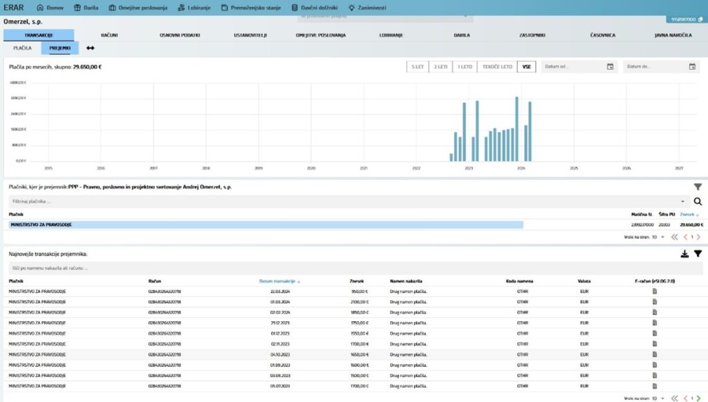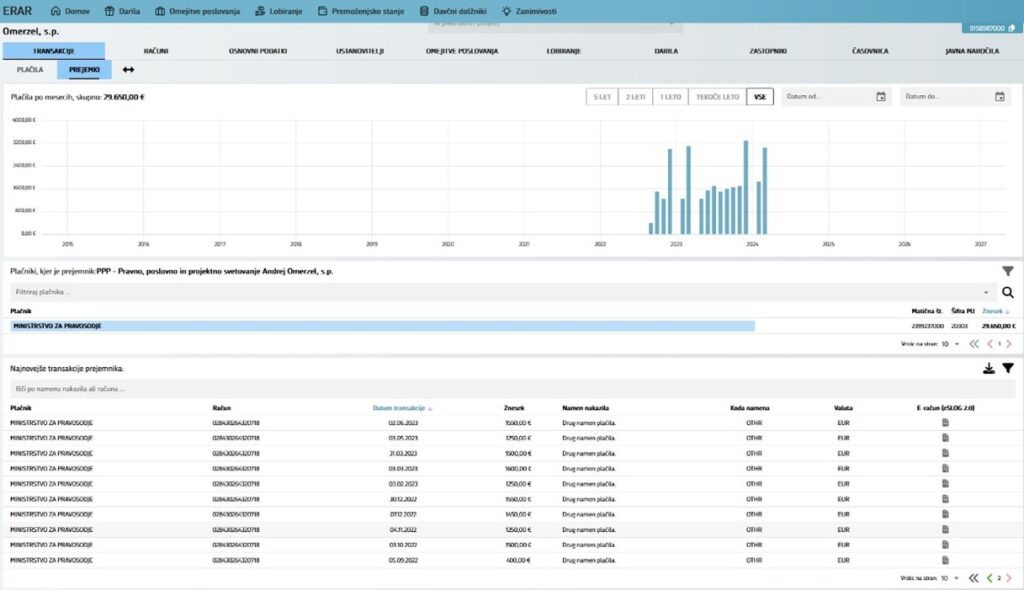 - Dne 20.2.2024 obe stranki podpišeta sporazum o prenehanju pogodbenega razmerja po pogodbi, za MP je podpisana ministrica Dominika Švarc Pipan, v njem pa ugotavljata, da sta tako izvajalec kot naročnik vse pogodbene obveznosti izpolnila (PRILOGA ŠT. 7). Po tem sporazumu bi moral imeti direktor Andrej Omerzel s strani MP plačano dogovorjeno skupno vsoto v višini 46.970 eur, vendar aplikacija ERAR dokazuje drugače. Od 5.9.2022 do 22.3.2024 je od MP vsak mesec dobil nakazano plačilo po računu različnih vsot, vendar skupaj le 29.650 eur in ne 46.970 eur, kot je dogovorjeno. Iz aplikacije je razvidno, da Omerzel z nikomer drugim ni posloval. Kje je razlika 17.320 eur? Poznavalci razmer na ministrstvu za pravosodje so potrdili, da je nova ministrica za pravosodje Andreja Katič, ki je nadomestila odstopljeno Dominiko Švarc Pipan, že na prvem sestanku z uslužbenci ministrstva zadržala in prepovedala dokončno izplačilo podjetju PPP Andrej Omerzel s.p., domnevno prav zaradi netransparentnosti in nesmiselnosti posla. Navedeno dejstvo ne bo težko preveriti na Ministrstvu za pravosodje. Vse to še dodatno dokazuje nezakonitost navedenega pogodbenega sodelovanja med MP in Andrejem Omerzelom.