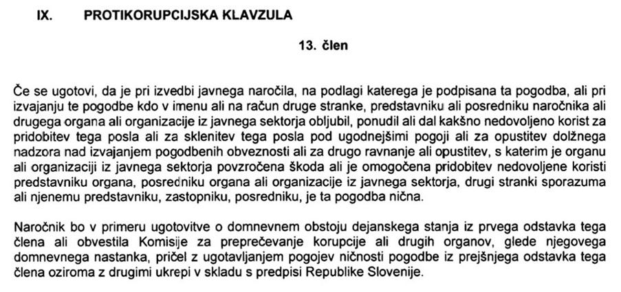 Civilna iniciativa Aktivni državljani samostojne Slovenije (v nadaljevanju CI ADSS) smo med našo aktivnostjo preiskovanja nezakonitosti na družbenopolitičnem področju Slovenije zaznali odklonskosti pri dodeljevanju poslov na Ministrstvu za pravosodje v letih 2022 do 2024. Gre za dodelitev posla na podlagi javnega razpisa, imenovanega “Koordinacija digitalizacije na področju pravosodja”, poslovnemu subjektu PPP – pravno, poslovno in projektno svetovanje Andrej Omerzel s.p., s sedežem Brodarjev trg 14, 1000 Ljubljana. Dne 25.7.2022 je bila med strankama Ministrstvo za pravosodje, Župančičeva 3, 1000 Ljubljana, ki ga je zastopala ministrica dr. Dominika Švarc Pipan in PPP Andrej Omerzel, Brodarjev trg 14, 1000 Ljubljana, sklenjena pogodba št. C2030-22-556326 (PRILOGA 1: Pogodba št. C2030-22-556326, z dne 25.7.2022). V pogodbi je sklenjeno in dogovorjeno, da bo izvajalec opravil skupno največ 300 ur dela, skupna vrednost te pogodbe pa znaša 18.300,00 eur z DDV. V pogodbi je v 13. členu natančno navedena tudi protikorupcijska klavzula, ki je obvezujoča za obe stranki.
