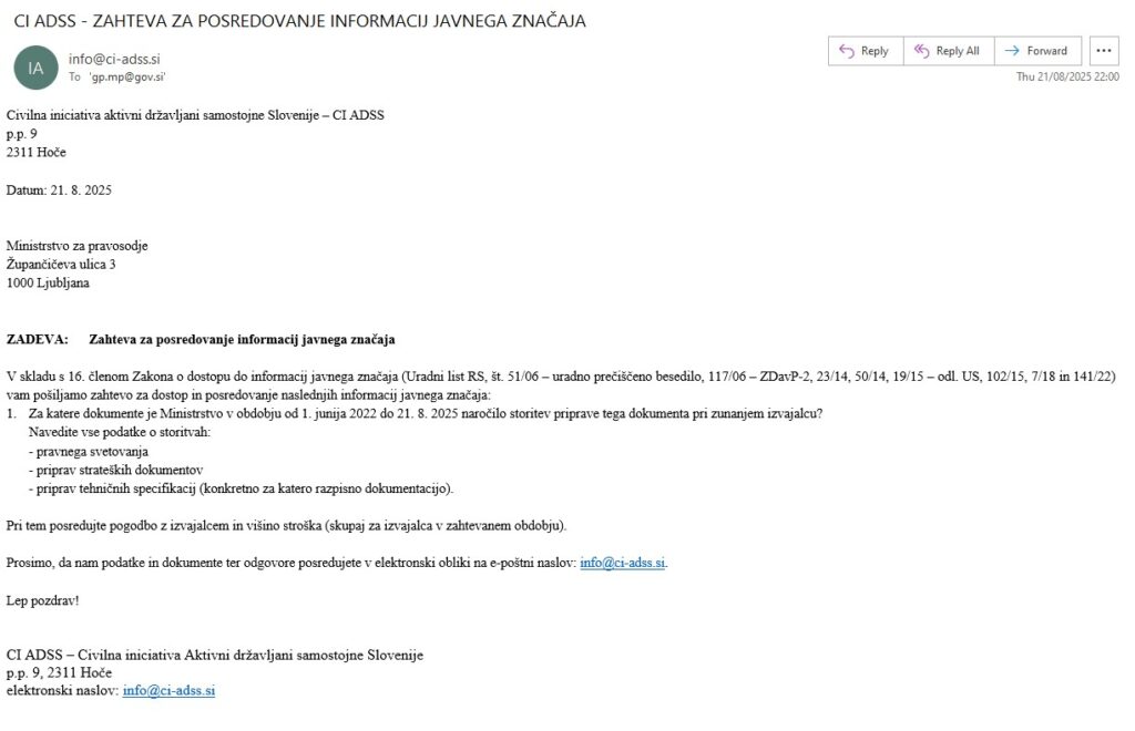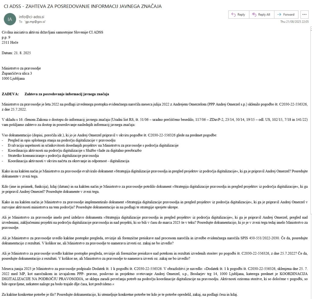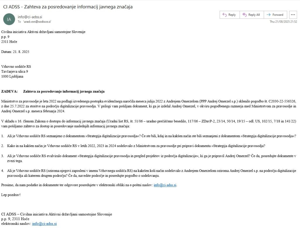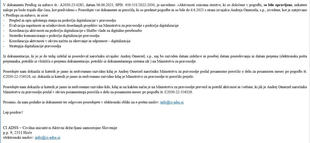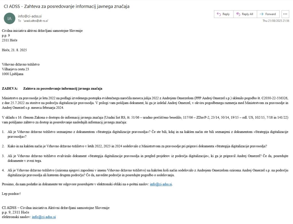 CI ADSS aktivno zbiramo obvestila in dokaze v zadevi “projekta digitalizacije pravosodja, pri katerem utemeljeno sumimo, da sta nekdanja pravosodna ministrica Dominika Švarc Pipan in podjetnik Andrej Omerzel naklepno in v sostorilstvu izvršila več kaznivih dejanj. V zvezi s tem smo daners, dne 21.8.2025 na Vrhovno sodišče Rs, Vrhovno državno tožilstvo RS in Ministrstvo za prvosodje podali zahteve za posredovanje informacij javnega značaja zaradi pridobitve še dodatnih informacij in dokumentov, s katerimi bomo še dodatno podkrepili in potrdili naše navedbe ter ugotovitve. V nadaljevanju objavljamo poslane zahteve CI ADSS na navedeneelektronske naslove: