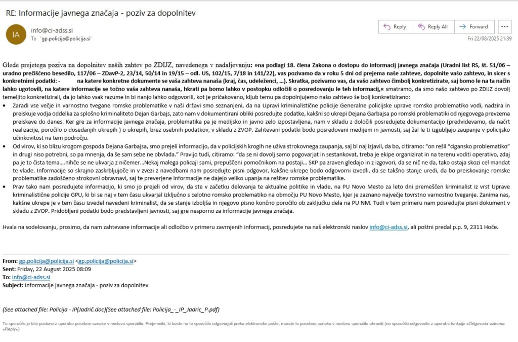 CI ADSS smo dne 17.8.2025 na policijo (gp.policija@policija.si) posredovali zahtevek za posredovanje informacij javnega značaja v zvezi pereče romske problematike, katerega smo objavili tudi na naši spletni strani ( https://ci-adss.si/?p=1801) in danes, dne 22.8.2025 od njih dobili poziv za dopolnitev našega zahtevka, v katerem nas pozivajo, da zahtevek bolj konkretiziramo in navedemo, na katere dokumente se sklicujemo. Poziv na dopolnitev smatramo kot neresen in poskus izogibanja pravim odgovorom, naš odgovor pa v nadaljevanju objavljamo v celoti.