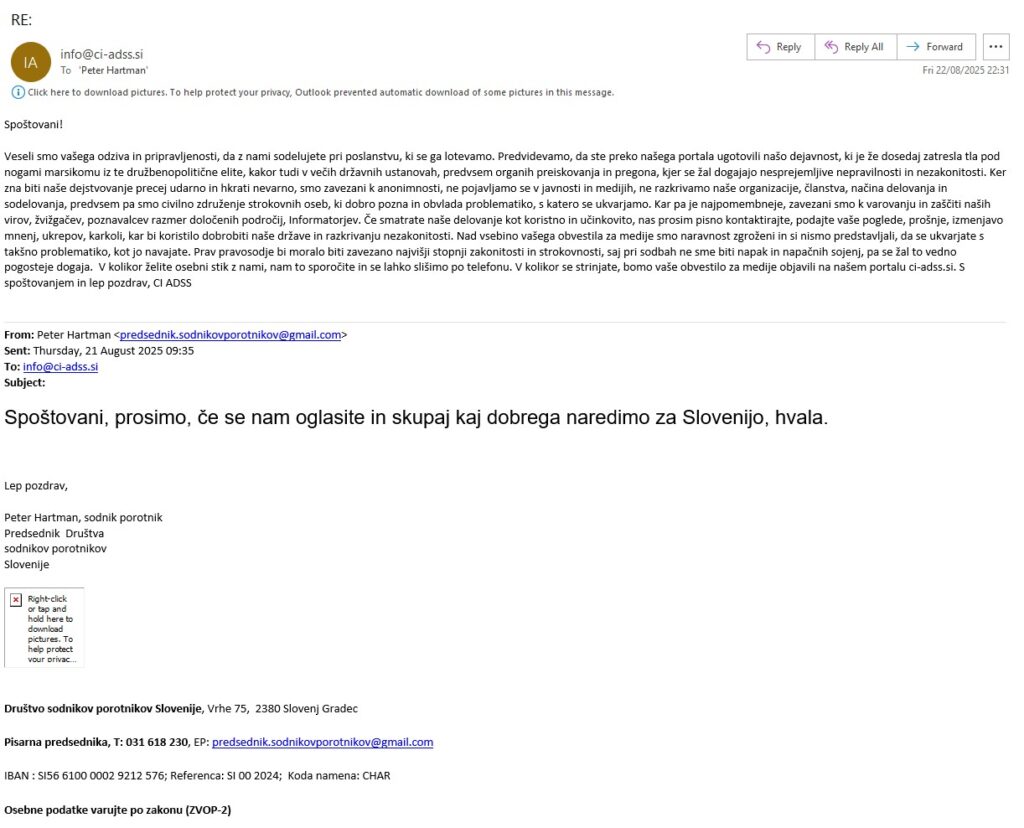 Veseli smo vašega odziva in pripravljenosti, da z nami sodelujete pri poslanstvu, ki se ga lotevamo. Predvidevamo, da ste preko našega portala ugotovili našo dejavnost, ki je že dosedaj zatresla tla pod nogami marsikomu iz te družbenopolitične elite, kakor tudi v večih državnih ustanovah, predvsem organih preiskovanja in pregona, kjer se žal dogajajo nesprejemljive nepravilnosti in nezakonitosti. Ker zna biti naše dejstvovanje precej udarno in hkrati nevarno, smo zavezani k anonimnosti, ne pojavljamo se v javnosti in medijih, ne razkrivamo naše organizacije, članstva, načina delovanja in sodelovanja, predvsem pa smo civilno združenje strokovnih oseb, ki dobro pozna in obvlada problematiko, s katero se ukvarjamo. Kar pa je najpomembneje, zavezani smo k varovanju in zaščiti naših virov, žvižgačev, poznavalcev razmer določenih področij, Informatorjev. Če smatrate naše delovanje kot koristno in učinkovito, nas prosim pisno kontaktirajte, podajte vaše poglede, prošnje, izmenjavo mnenj, ukrepov, karkoli, kar bi koristilo dobrobiti naše države in razkrivanju nezakonitosti. Nad vsebino vašega obvestila za medije smo naravnost zgroženi in si nismo predstavljali, da se ukvarjate s takšno problematiko, kot jo navajate. Prav pravosodje bi moralo biti zavezano najvišji stopnji zakonitosti in strokovnosti, saj pri sodbah ne sme biti napak in napačnih sojenj, pa se žal to vedno pogosteje dogaja. V kolikor želite osebni stik z nami, nam to sporočite in se lahko slišimo po telefonu. V kolikor se strinjate, bomo vaše obvestilo za medije objavili na našem portalu ci-adss.si. S spoštovanjem in lep pozdrav, CI ADSS