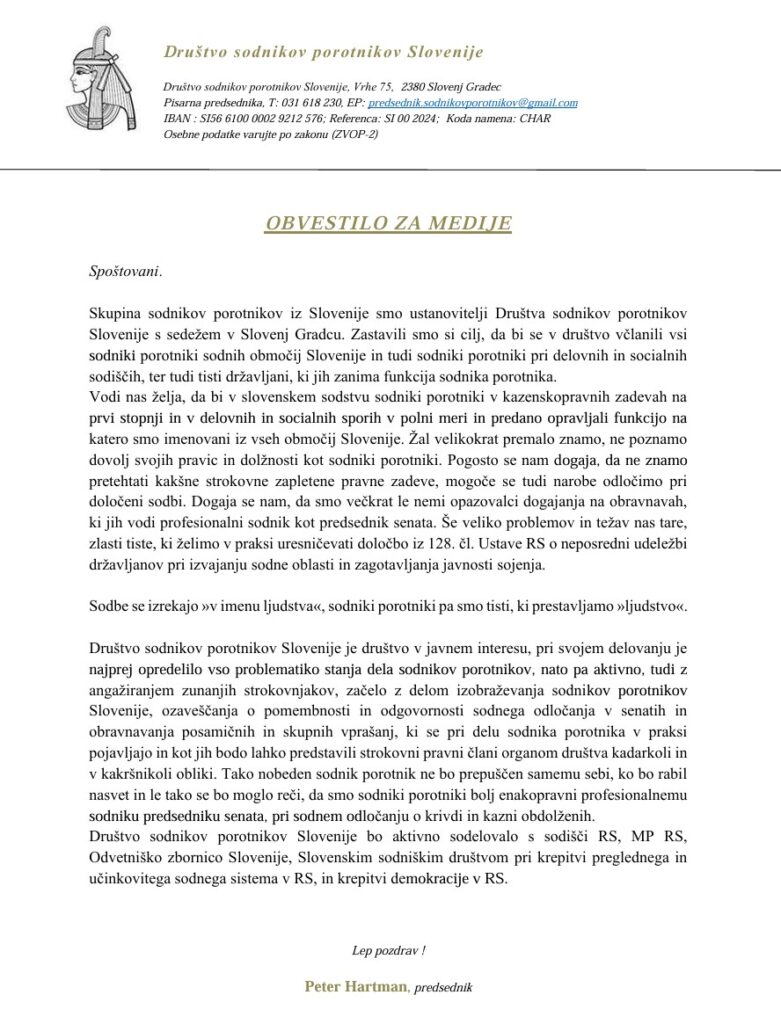 V CI ADSS je prispelo obvestilo za medije, ki nam ga je posredovalo Društvo sodnikov porotnikov Slovenije s prošnjo, da se jim oglasimo in da skupaj kaj dobrega naredimo za Slovenijo. Podpisnik je predsednik društva Peter Hartman. Z veseljem smo se odzvali, saj smo iz obvestila za medije razbrali šokantnerazmere na tem področju pravosodja, ki bi moralo biti zavezano k poštenosti, strokovnosti, objektivnosti in zakonitosti, pa žal temu vse pogosteje ni tako. O nadaljnjem sodelovanju z Društvom sodnikov porotnikov bomo vsekakor sproti poročali. V nadaljevanju objavljamo njihovo obvestilo za medije…