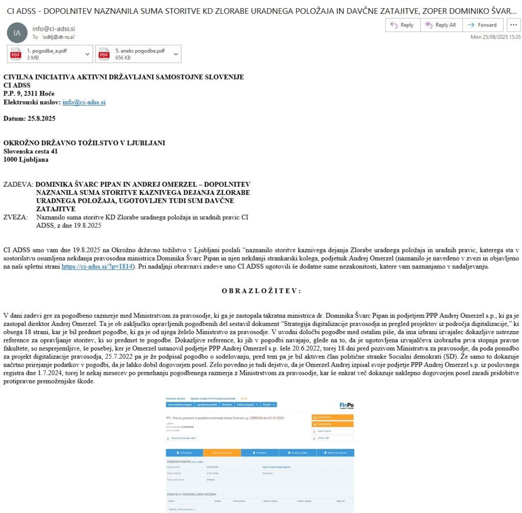 CI ADSS smo danes, dne 25.8.2025 na Okrožno državno tožilstvo v ljubljani podali dopolnitev naznanila suma storitve kaznivega dejanja Zlorabe uradnega položaja in Davčne zatajitve, katerih utemeljeno sumimo nekdanjo pravosodno ministrico Dominiko Švarc Pipan in pogodbenika Ministrstva za pravosodje Andreja Omerzela. Podrobnosti prvotnega naznanila so objavljene na naši spletni strani: https://ci-adss.si/?p=1814. Tokrat dopolnitve naznanila ne bomo v celoti objavljali, zaradi interesov preiskave.