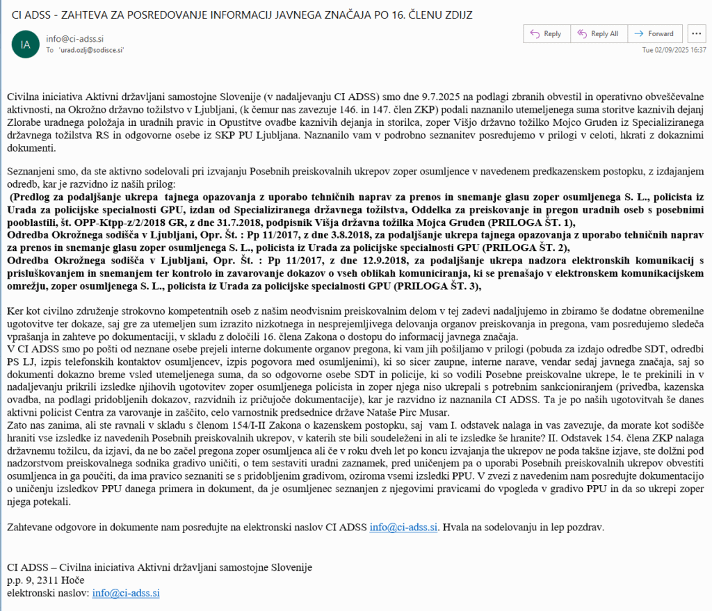 1 thought on “CI ADSS NA OKROŽNO SODIŠČE V LJUBLJANI PODALI ZAHTEVEK ZA DOSTOP DO INFORMACIJ JAVNEGA ZNAČAJA V ZVEZI NAŠEGA NAZNANILA UTEMELJENEGA SUMA STORITEV KAZNIVIH DEJANJ TOŽILKE SDT IN ODGOVORNIH V POLICIJI”