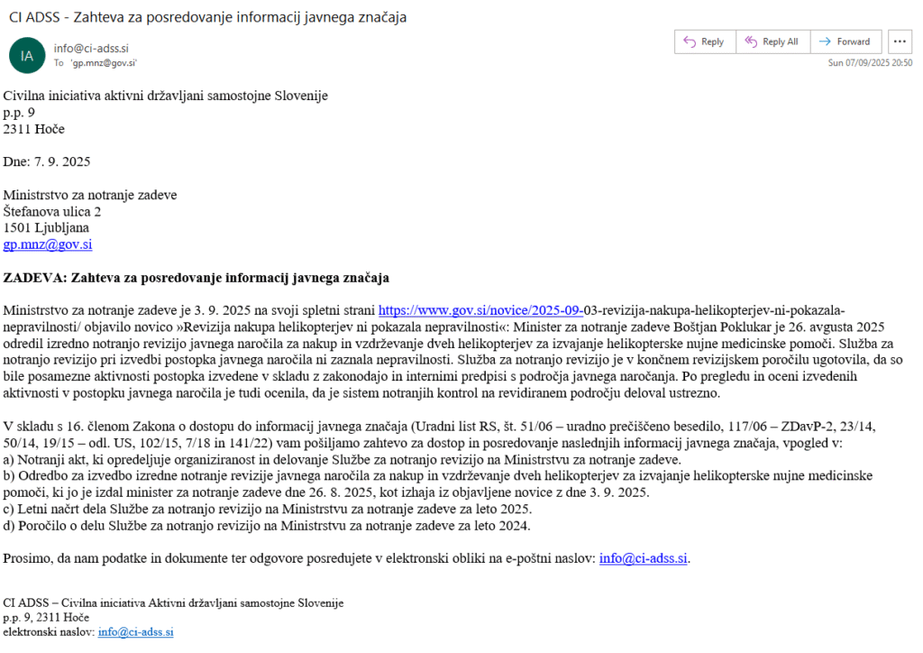 Ker CI ADSS aktivno preverjamo okoliščine nakupa dveh helikopterjev za izvajanje nujne medicinske pomoči in sume nepravilnosti pri javnem naročilu, smo na MNZ podali zahtevo za dostop do informacij javnega značaja z naslednjo vsebino: