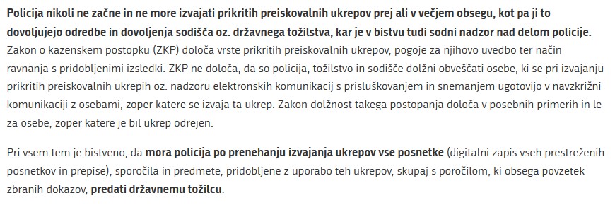 Iz navedenega je razvidno, da gre za najbolj občutljiva in hkrati rigorozna policijska pooblastila, ki jih je moč uporabiti zoper osumljene osebe in jih treba izvajati skrajno zakonito in transparentno. S tem se načeloma strinja tudi sama Policija na njihov spletni strani Policija.si: