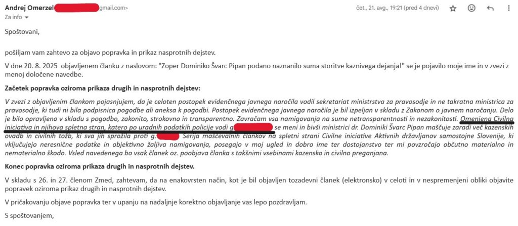 V njem od spletnega medijskega portala e-maribor.si zahteva, da objavi popravek in prikaz nasprotnih dejstev, ki jih je e-maribor dne 20.8.2025 objavil na njihovem portalU v članku z naslovom: “Zoper Dominiko Švarc Pipan podano naznanilo suma storitve kaznivega dejanja”, v katerem se je pojavilo njegovo ime in v zvezi z njim določene navedbe ter pri tem zavrača vsa namigovanja in sume netransparentnosti in nezakonitosti. Nadalje omenja Civilno iniciativo Aktivni državljani samostojne Slovenije, ki je navedeni članek v osnovi prvotno objavila na njihovi spletni strani ci-adss.si, to civilno iniciativo pa “PO URADNIH PODATKIH POLICIJE VODI …………..”, ki se njemu in nekdanji pravosodni ministrici Dominiki Švarc Pipan maščuje s serijo objav na spletni strani Civilne iniciative Aktivnih državljanov samostojne Slovenije, saj so uperjene proti njima in to zaradi več kazenskih ovadb in civilnih tožb, ki sta jih sprožila proti …………… Objave naj bi vključevale neresnične podatke in objektivno žaljiva namigovanja ter posegajo v ugled, dobro ime, dostojanstvo Andreja Omerzela ter mu povzročajo občutno materialno in nematerialno škodo. Od portala e-maribor zahteva objavo popravka, oziroma prikaz drugih, nasprotnih dejstev.