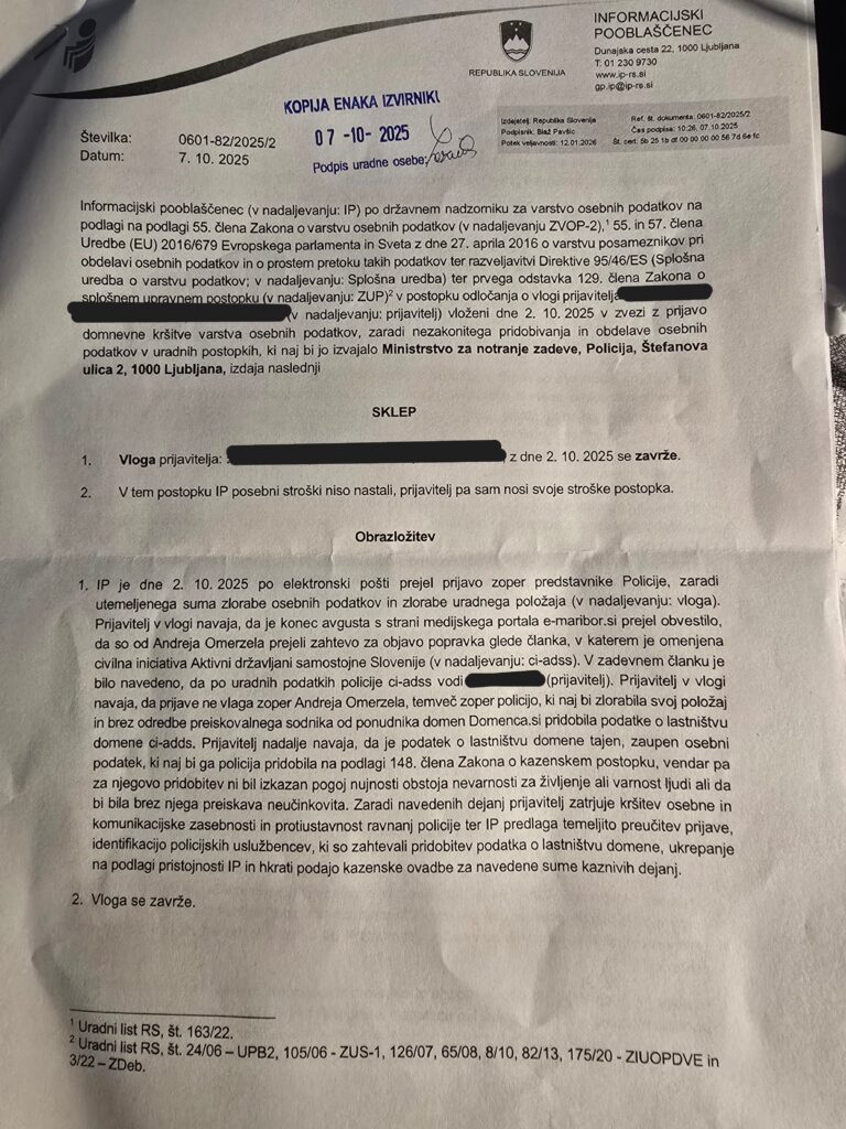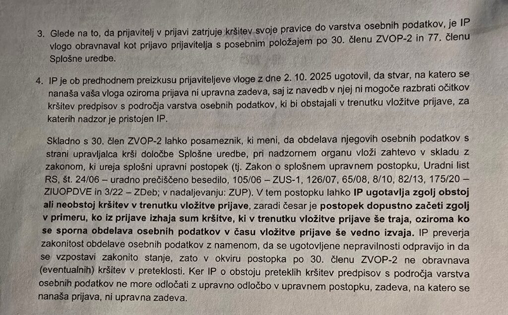 Presenetljivo je prijavitelj že 8.10.2025 po pošti prejel odgovor informacijskega pooblaščenca, sklep o zavržbi prijave. V CI ADSS smo seznanjeni z neko drugo prijavo, podano IP, kjer pa že več mesecev ni pričakovanega odgovora z izgovorom, da imajo ogromno dela, 104 zadeve v reševanju. Sklep v našem primeru pa je spisan v petih dneh?