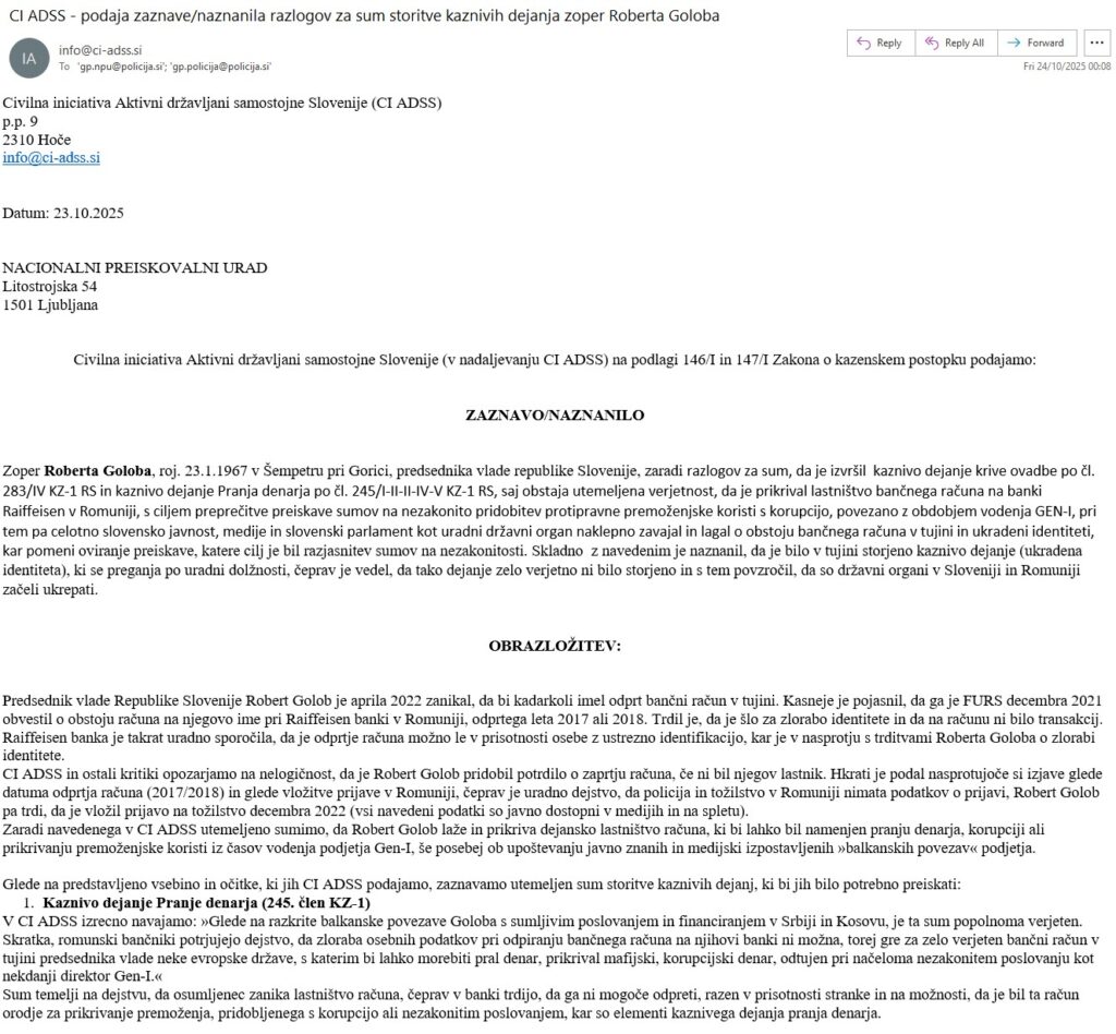 CI ADSS smo danes, 23.10.2025 podali zaznavo/naznanilo suma storitve večih kaznivih dejanj, katere sumimo predsednika vlade Roberta Goloba v zadevi ukradene identitete pri odpiranju bančnega računa v Raiffeisen banki v Romuniji. Naznanilo v celoti objavljamo v nadaljevanju.