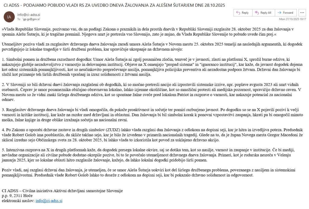 »Vlada Republike Slovenije, pozivamo vas, da na podlagi Zakona o praznikih in dela prostih dnevih v Republiki Sloveniji razglasite 28. oktober 2025 za dan žalovanja v spomin Alešu Šutarju, ki je tragično preminil. Njegova smrt je pretresla vso Slovenijo, zato je nujno, da Vlada Republike Slovenije to pobudo uvede čim prej.«