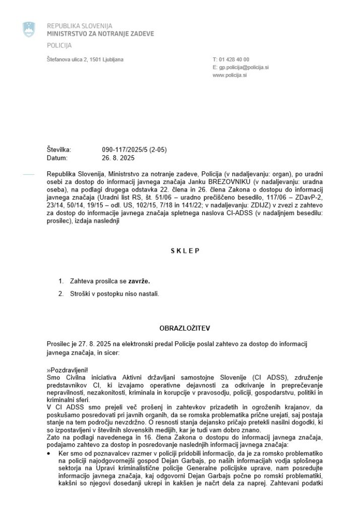 Od PU Maribor smo prejeli sledeči odgovor, oziroma sklep o zavržbi naše zahteve, saj je na njihov poziv nismo dopolnili v zakonitem roku.