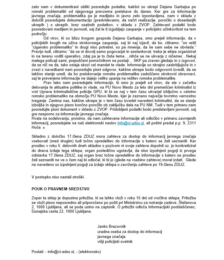 Njihov odgovor, oziroma Sklep o zavržbi naše zahteve pa je zanimiv tudi v dejstvu, da so se tako v mariborski, kot tudi v ljubljanski policiji uskladili v odgovorih na naše zahteve po ZDIJZ in zavržbah. Ugotovljen je namreč enak modus, s katerim se distancirajo in izognejo razprave o preveč vročih temah, v katere bi lahko bili vpleteni v policiji. Enak primer predstavljamo v nadaljevanju, kjer smo na GPU podali zahtevo po ZDIJZ glede romske problematike, pa smo od njih dobili sledeč odgovor, ki je v delu obrazložitve in poziva po dopolnitvi na drugi strani copy paste mariborskemu, razlikujeta se le vsebinsko. Navedba nesporno pritrjuje našim ugotovitvam, da med njimi velja dogovor, na kak način ukrepati, odgovoriti na naše zahteve in se izogniti njim škodljivim vprašanjem.
