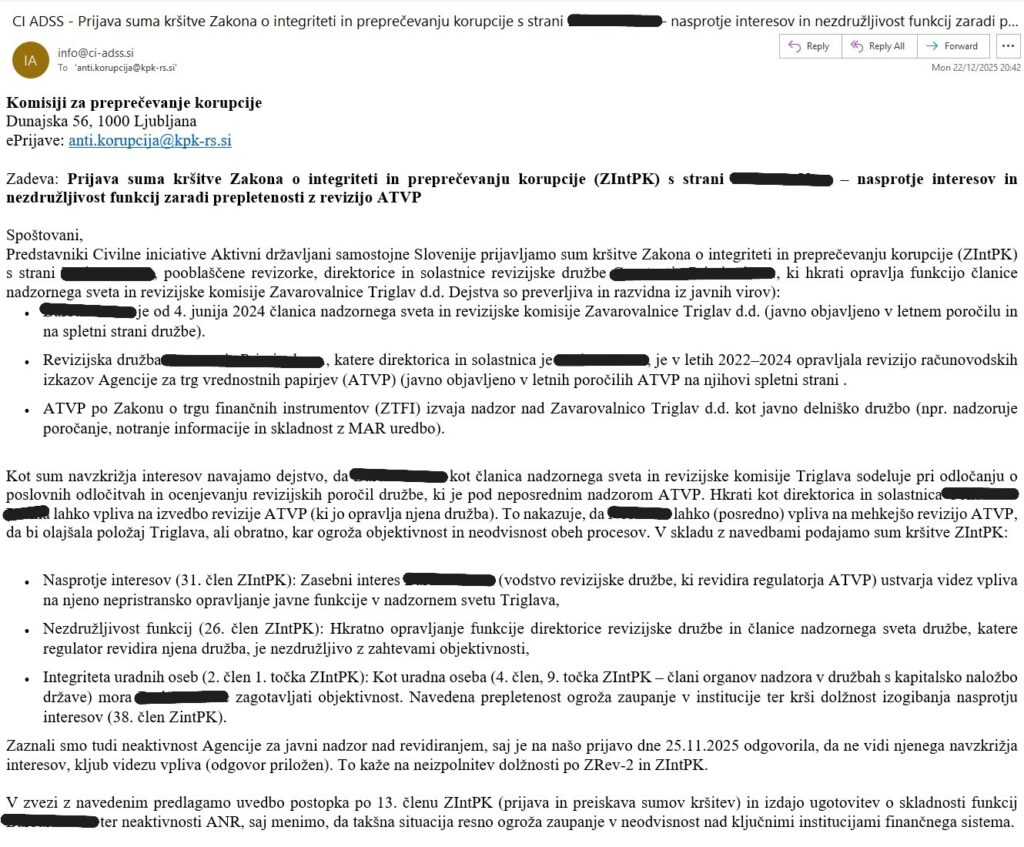 Predstavniki Civilne iniciative Aktivni državljani samostojne Slovenije prijavljamo sum kršitve Zakona o integriteti in preprečevanju korupcije (ZIntPK) s strani B. N., pooblaščene revizorke, direktorice in solastnice revizijske družbe C…, ki hkrati opravlja funkcijo članice nadzornega sveta in revizijske komisije Zavarovalnice Triglav d.d. Dejstva so preverljiva in razvidna iz javnih virov):