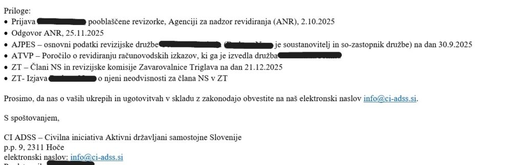Zaznali smo tudi neaktivnost Agencije za javni nadzor nad revidiranjem, saj je na našo prijavo dne 25.11.2025 odgovorila, da ne vidi njenega navzkrižja interesov, kljub videzu vpliva (odgovor priložen). To kaže na neizpolnitev dolžnosti po ZRev-2 in ZIntPK.